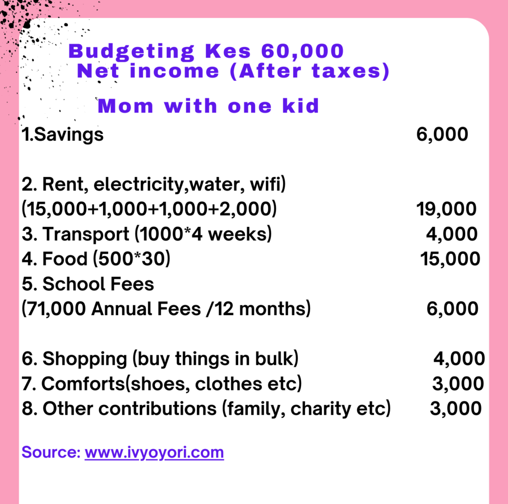 When working with a fixed income, the first step is understanding your necessary expenses and saving priorities. Here’s a look at a sample budget for a mom managing KES 60,000 per month: